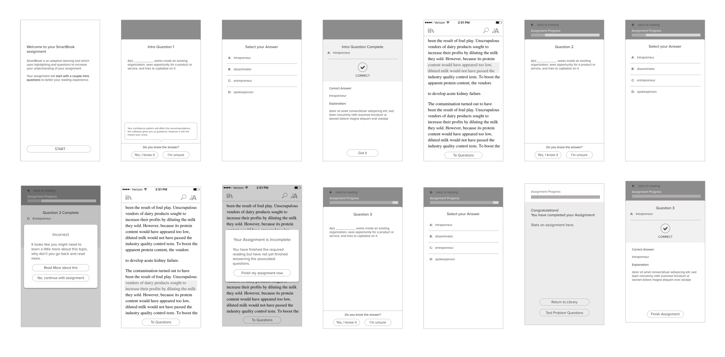 These screens show how a user would progress through an assignment. Here a user is starting with reading, moving onto answering questions and answering the question correctly.
